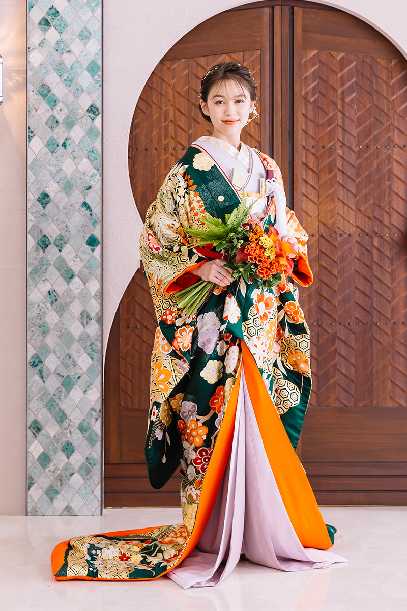 We always have over 100 pieces of colored uchikake, Shiromuku, and hikifurisode in stock. Enjoy the quality of authentic Japanese clothing used at weddings at first-class hotels and popular guesthouses.